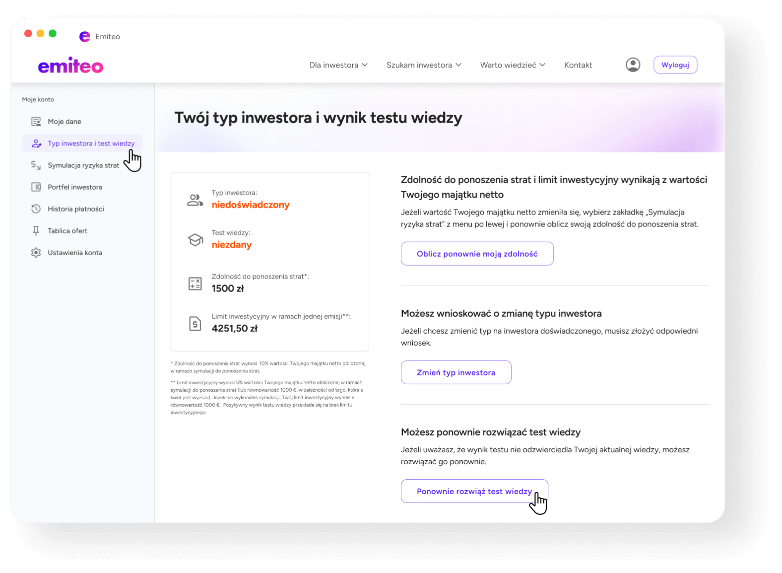 By to zrobić, przejdź do sekcji Moje konto, wybierz zakładkę TYP INWESTORA I TEST WIEDZY i wybierz opcje Ponownie rozwiąż test wiedzy.