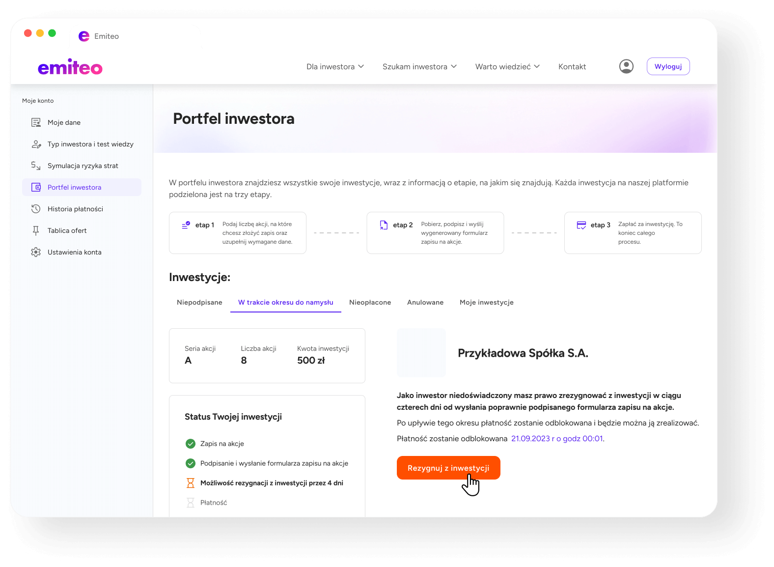 Z zapisu na akcje lub zawarcia umowy objęcia akcji mogą zrezygnować wyłącznie inwestorzy niedoświadczeni, którym nie minął okres do namysłu (tj. cztery dni od złożenia zapisu na akcje, bądź zawarcia umowy objęcia akcji, do odblokowania płatności).